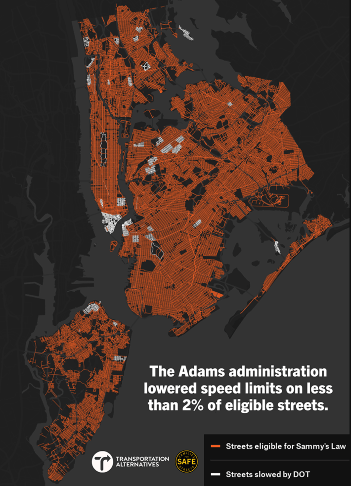 Neither Mayor Adams nor then-Council Speaker Adrienne Adams moved towards implementing Sammy’s Law citywide. As a result, community boards around town are slowly demanding that their district get reduced speed limits, as Streetsblog has reported (map above).