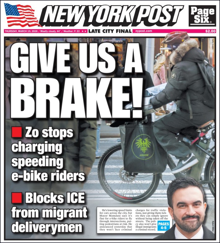 Yet the New York Post's front page crowed, "Zo stops charging speeding e-bike riders," but that's a lie. As noted above, Mamdani has not called off enforcement of traffic laws against cyclists — he's simply downgraded that enforcement to the same level as NYPD's civil enforcement of car and truck violations.