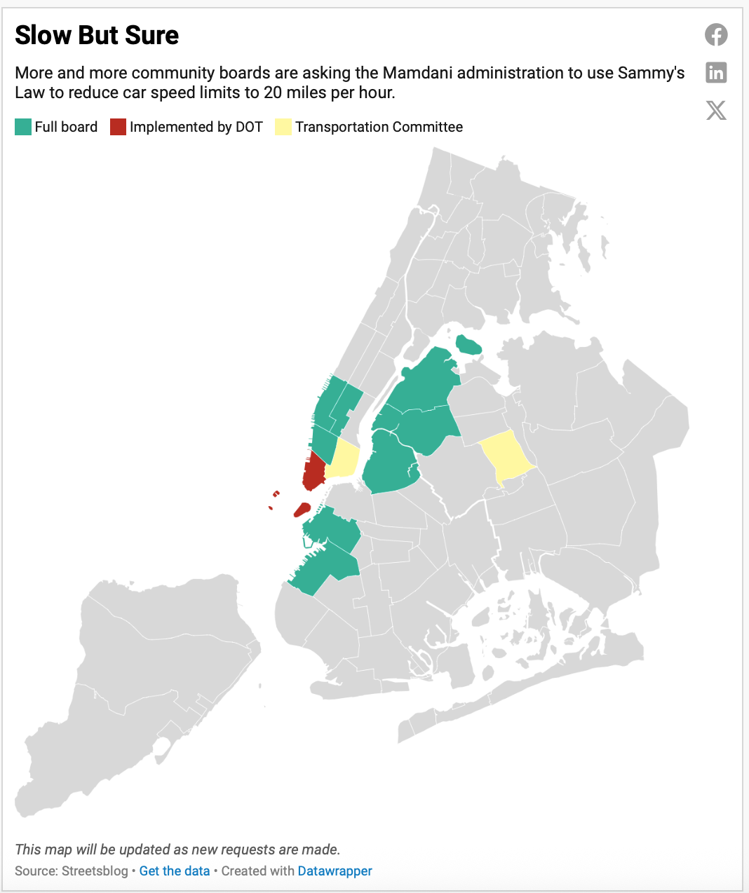 Eight community boards across New York City, representing more than 1 million residents, have asked the city Department of Transportation to designate their districts as “slow zones” with 20-mile-per-hour car speed limits. The push comes as Mayor Mamdani and the City Council bicker over who can implement the 2024 state law that allows the city to reduce speed limits below the statewide 25-mph minimum.