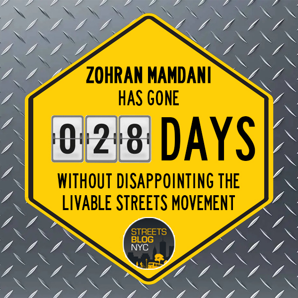 - You’ll notice from our daily Mamdani-O-Meter on our home page (and here, right) that the mayor has set a new record for going 28 days without disappointing the livable streets movement (which he last did on March 3). But Hizzoner is officially on notice, given that he refused to commit to repairing one of his predecessor’s great mistakes: the removal of three blocks of the Bedford Avenue protected bike lane at the behest of religious leaders in the neighborhood. Our own Kevin Duggan asked the mayor if he would restore the bike lane — as he promised during the campaign — and make our streets the envy of the world — as he has promised pretty much every day since Jan. 1 — but he demurred. “I’m going to follow up with DOT and get back to you,” he told Duggan.