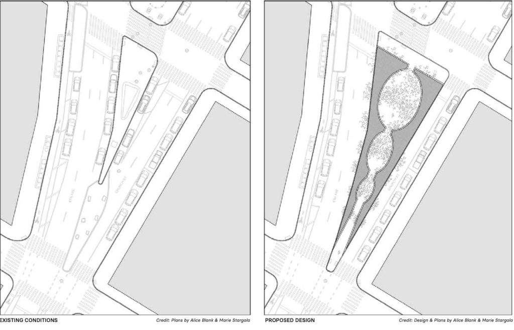 The triangle is part of the “Greenstreets” program jointly run by the departments of Transportation and Parks, despite being mostly concrete. Both agencies would need to participate in any potential changes — and DOT, for its part, expressed interest in a statement.