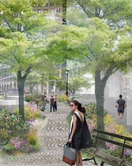 “We feel that that plaza could be improved,” said Alice Blank, the chairwoman of Friends of Barnett Newman Triangle. “If you stand out there, it’s really used, and to have two sidewalks rather than one straight path down the center seems useless when you could have a zone on either side of a path that’s green and acts as both a buffer and an extension of the green space.”