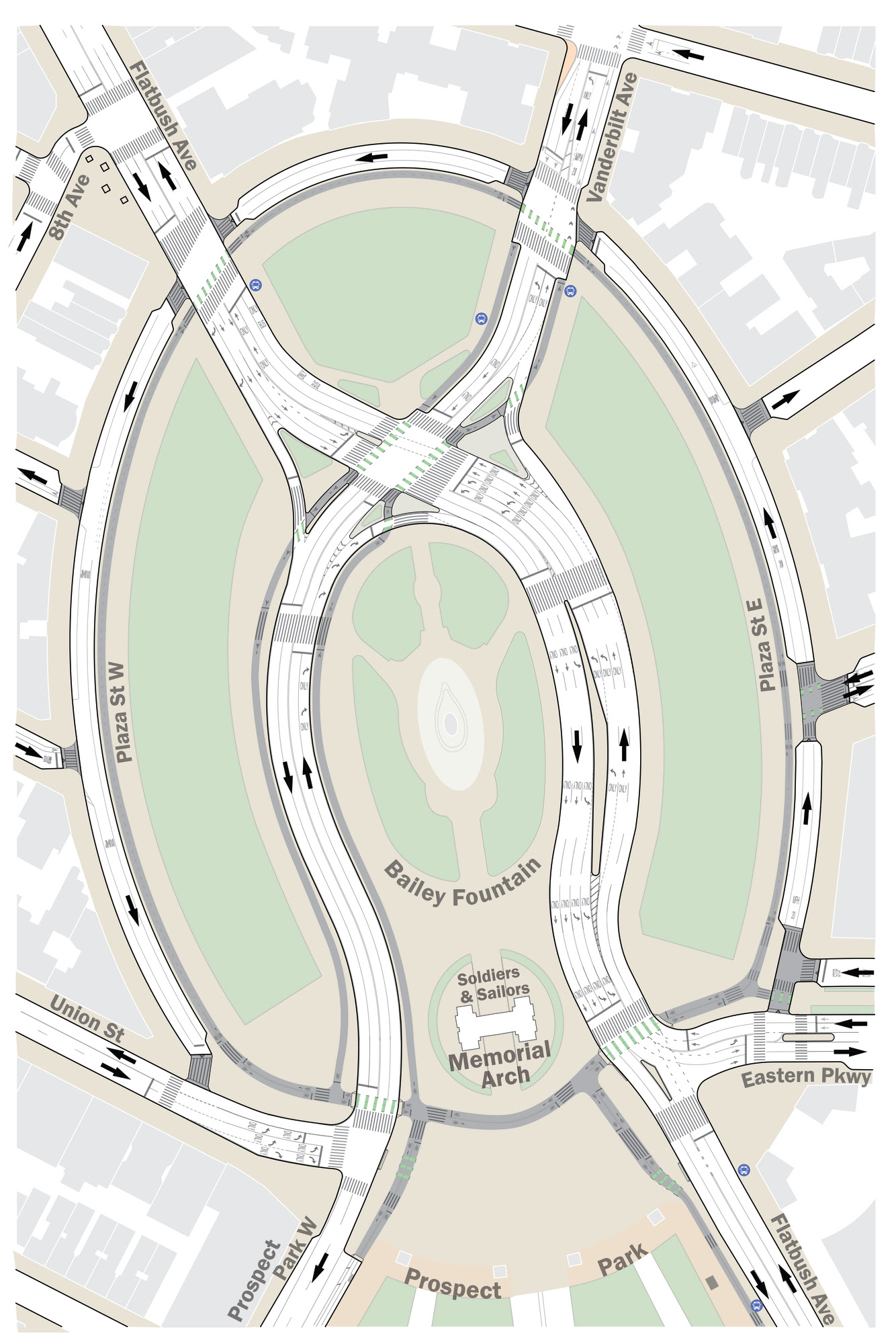 DOT’s latest plan simplifies the traffic flow in and around the plaza by removing drivers’ ability to travel all the way around the inside of its traffic circle (to view the current layout, click here). Northbound and southbound drivers on Flatbush Avenue would use the east side of the inner circle. Southbound drivers coming from Vanderbilt Avenue and northbound drivers coming off of Union Street would occupy the west side of the circle:
