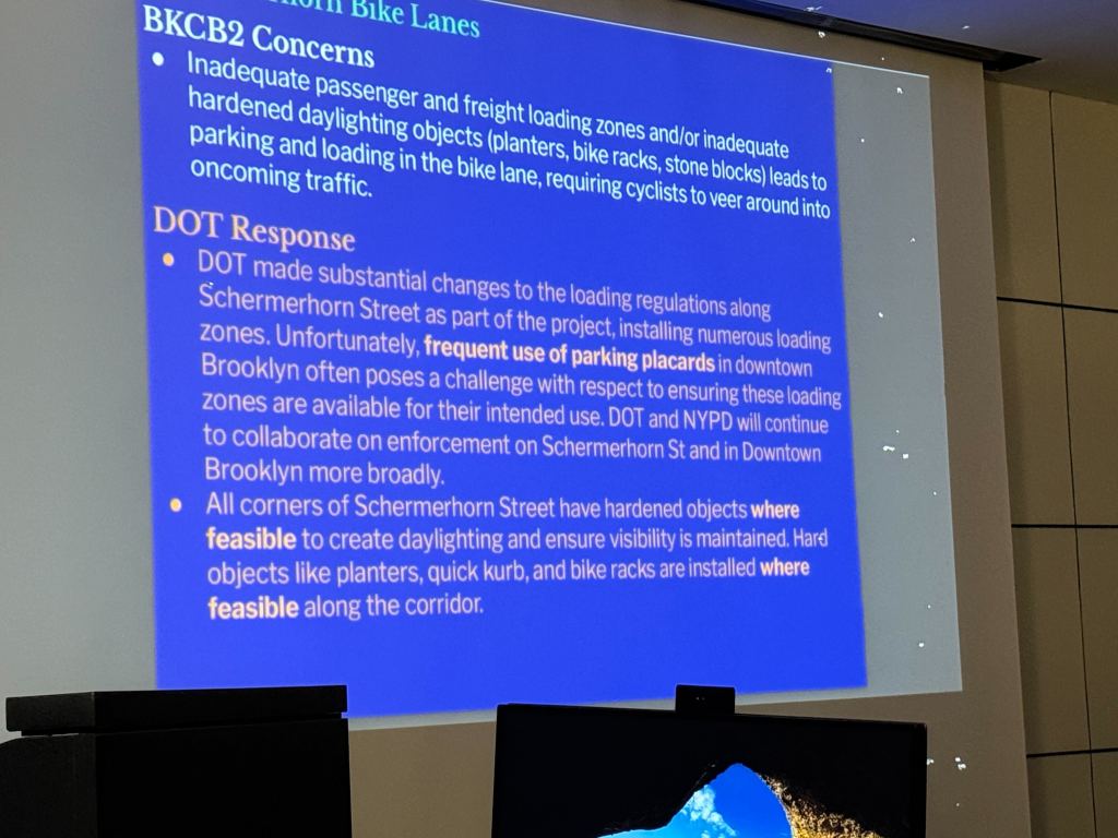The committee’s vote followed a DOT update on the status of its 2022 protected bike lane redesign of Schermerhorn Street and 2023 busway redesign of Livingston Street. The two-way bike lane sees nearly two thousand cyclists per day, but delivery vehicles servicing nearby stores routinely block it — despite the fact that DOT set aside loading zones along the corridor to give those trucks a place to park.