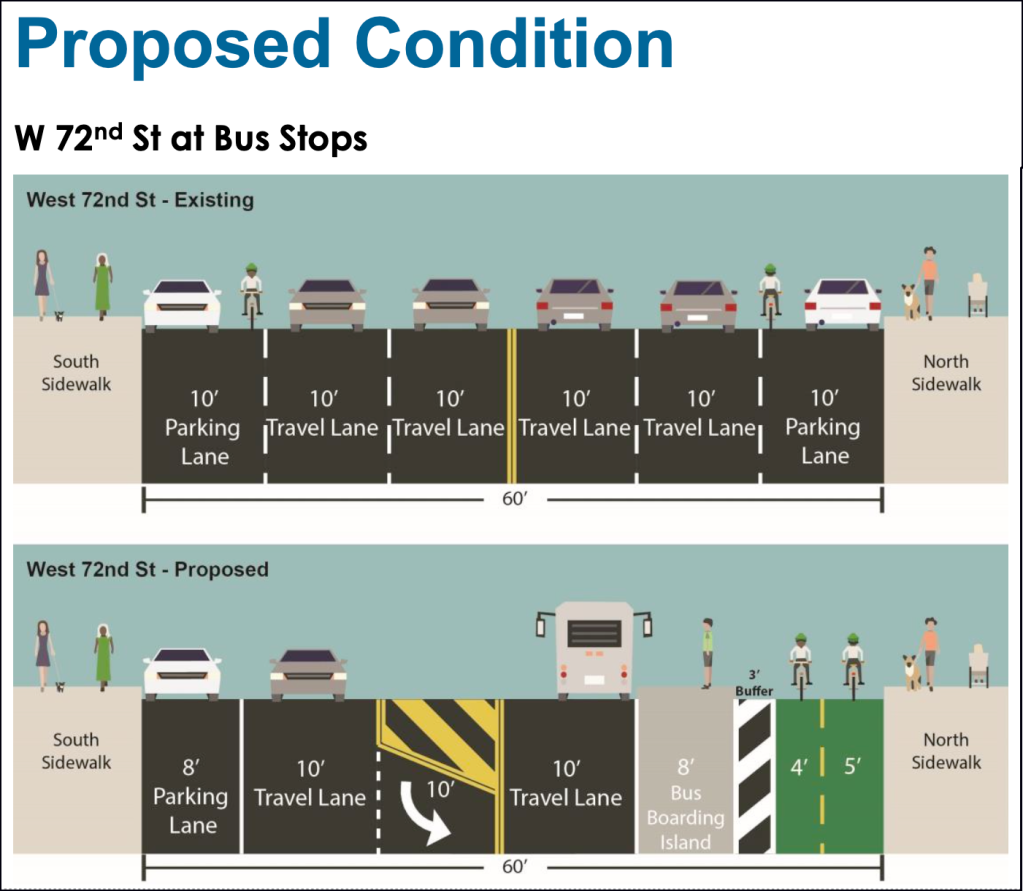 Bus riders will get eight-foot-wide raised boarding islands as well as crosswalks and signs alerting cyclists to the fact that bus riders will be crossing the lane. Ten parking spots will be repurposed on the entire 72nd Street corridor.