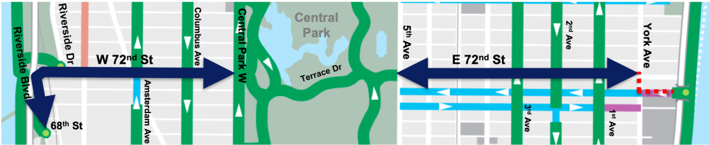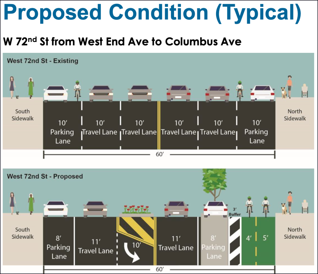 The safety improvements for West 72nd Street will convert four lanes of traffic into two, with a center turning bay, adding a two-way protected bike lane on the north side of the street. That configuration will model the department’s plan for East 72nd Street, making the car-dominated street a true multi-modal cross-town connector that will allow cyclists to seamlessly and safely ride all the way across town, through Central Park and Riverside Park to the Hudson River Greenway, thanks to a new connection.