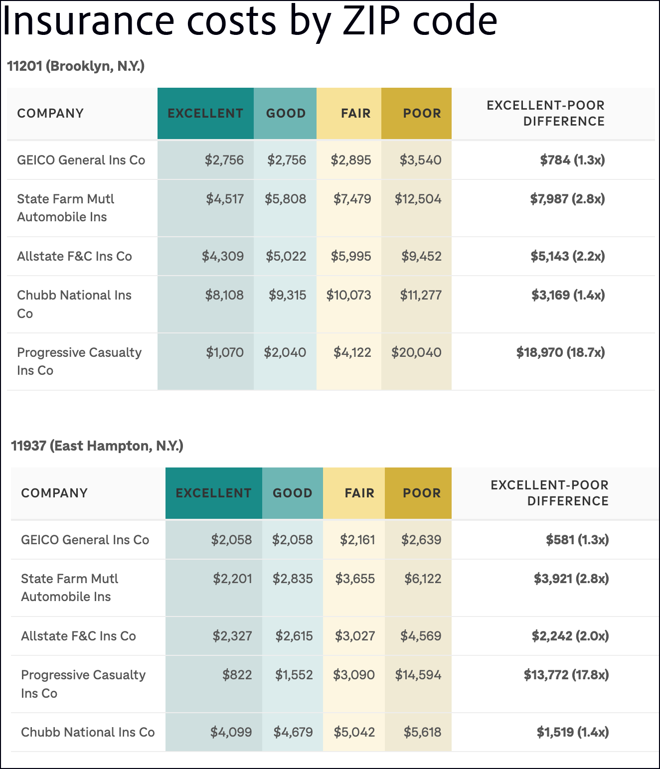 Insurance rates can vary greatly by ZIP code, even within the same city or state, an NPR pricing tool shows. For example, drivers can save thousands of dollars a year if they “garage” their car in East Hampton’s 11937 versus Downtown Brooklyn’s 11201.