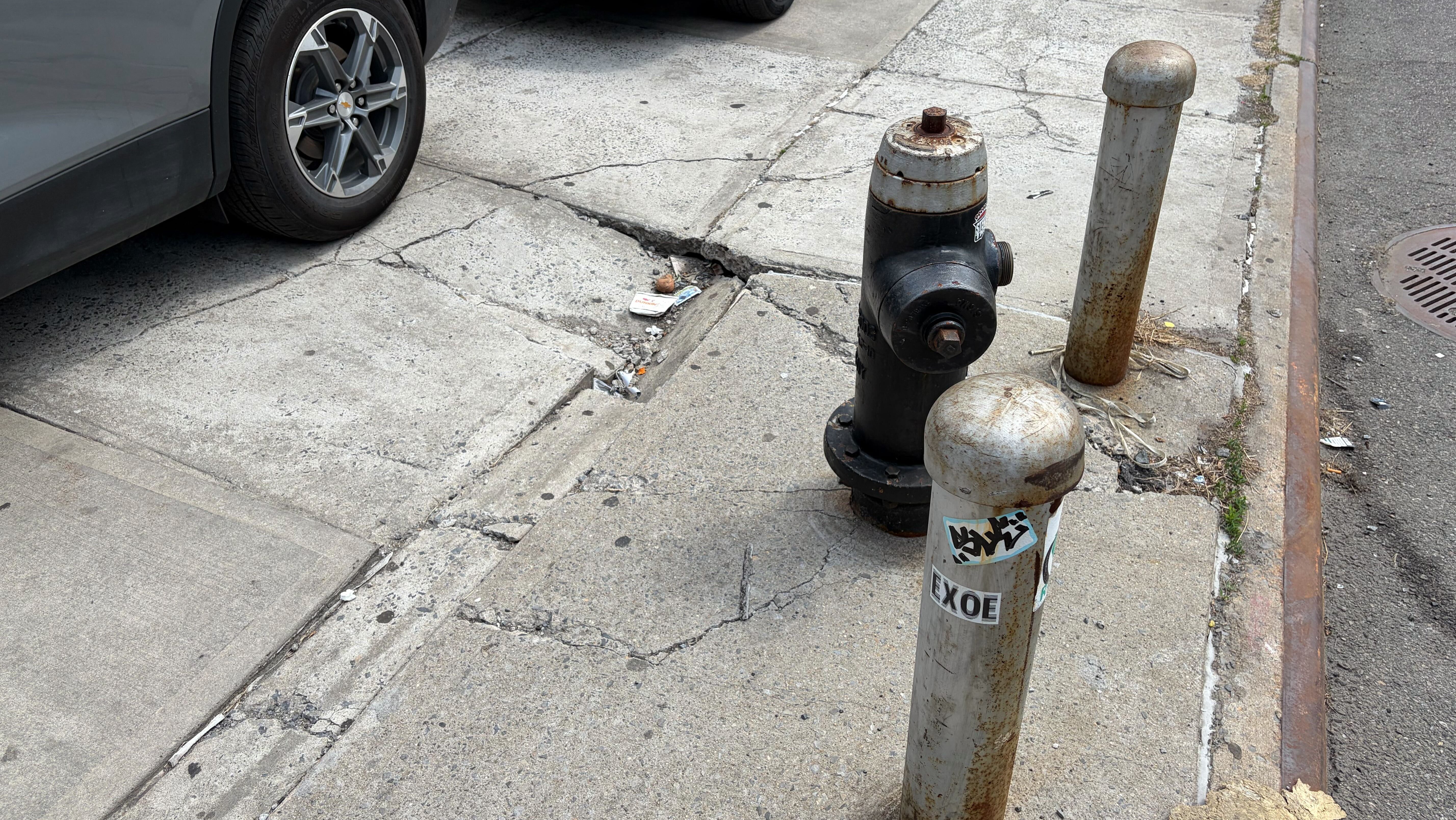 The rampant illegal parking in the area dates back to at least November 2020, according to Google Street View. One section of the sidewalk near a fire hydrant has actually started crumbling from the constant strain of the multi-ton cars sitting where they should not: