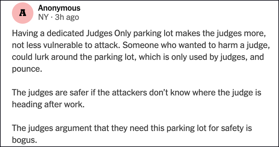 Our other good story in the Times was Dana Rubinstein’s deep dive into the long and tortured history of a tiny corner of a Brooklyn park that has been seized by judges for the purpose of parking their cars under the false premise that they need parking because they get death threats. Indeed, as one Times commenter pointed out, the last thing a judge needs is a big sign that reads, “Judges’ Parking Only”: